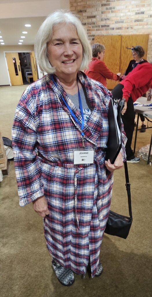 Jeanne Nadenicek woke up too late to get dressed, but had her priorities straight and made it to rehearsal on time, anyway! She is one dedicated chorister!